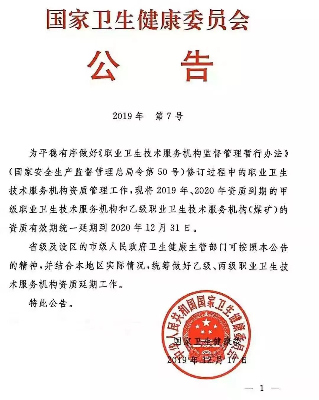 “现将2019年、2020年资质到期的甲级职业卫生技术服务机构和乙级职业卫生技术服务机构(煤矿)的资质有效期统一延期到2020年12月31日”